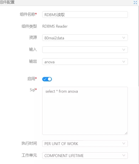 首先,我們需要在數據大腦系統中進行流程的搭建,思路是從數據庫中讀取數據后,將數據投入到單因素方差分析組件中,然后對算法運行所需要配置的參數進行配置,下圖是對數據庫讀取組件的配置: